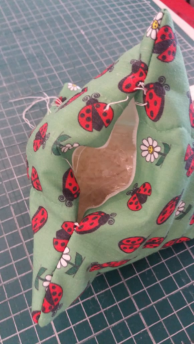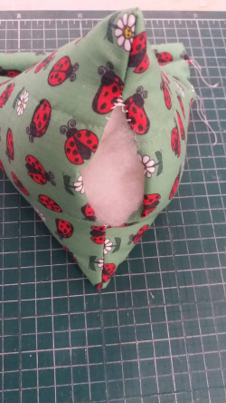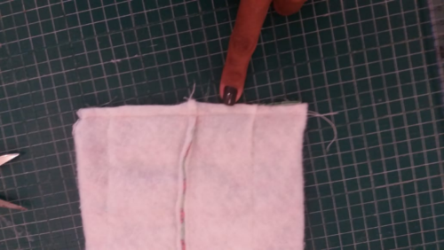 10) Vire novamente a peça para o lado avesso. Agora, vamos fazer a última costura, que vai formar a almofadinha.  Atenção agora. As duas últimas costuras que fizemos em cima das marcações foram na vertical.  Essa costura que vai fechar é na horizontal. Lembre-se de deixar um espaço de um palmo para encher a almofadinha.
